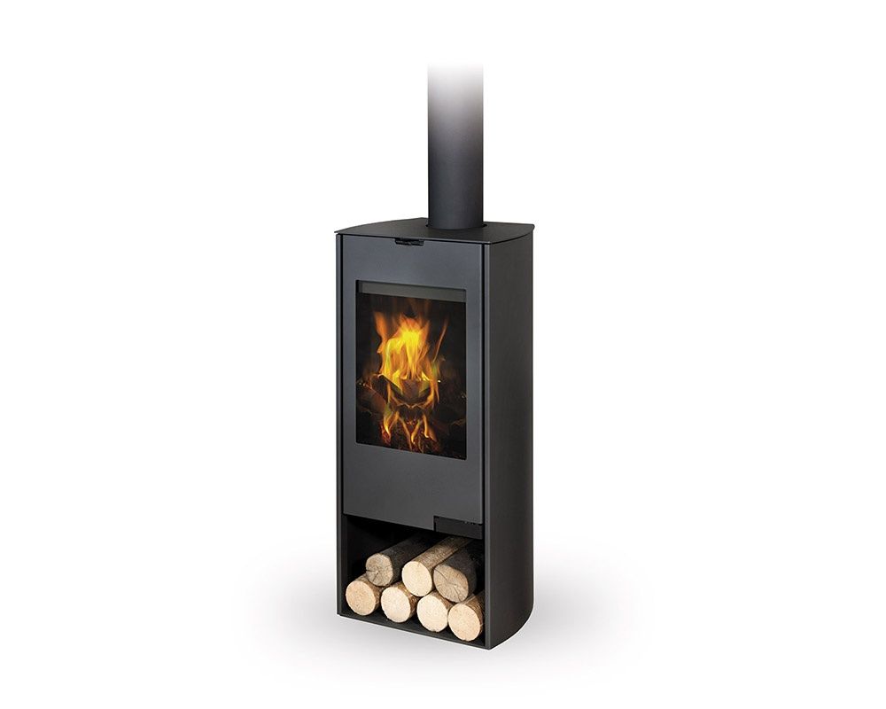 Esta estufa de leña es apta para todo tipo de interiores. El diseño de la estufa permite la conexión opcional de humos en ambos sentidos, superior o posterior. Gracias a la entrada de aire secundario, el vidrio de la puerta se lava con aire para evitar la acumulación de hollín. La cámara de combustión está revestida con cerámica "chamotta". Las tomas de aire primario y secundario están reguladas por un único elemento de control. La parte inferior de la estufa se puede utilizar para almacenar una pequeña cantidad de leña.
