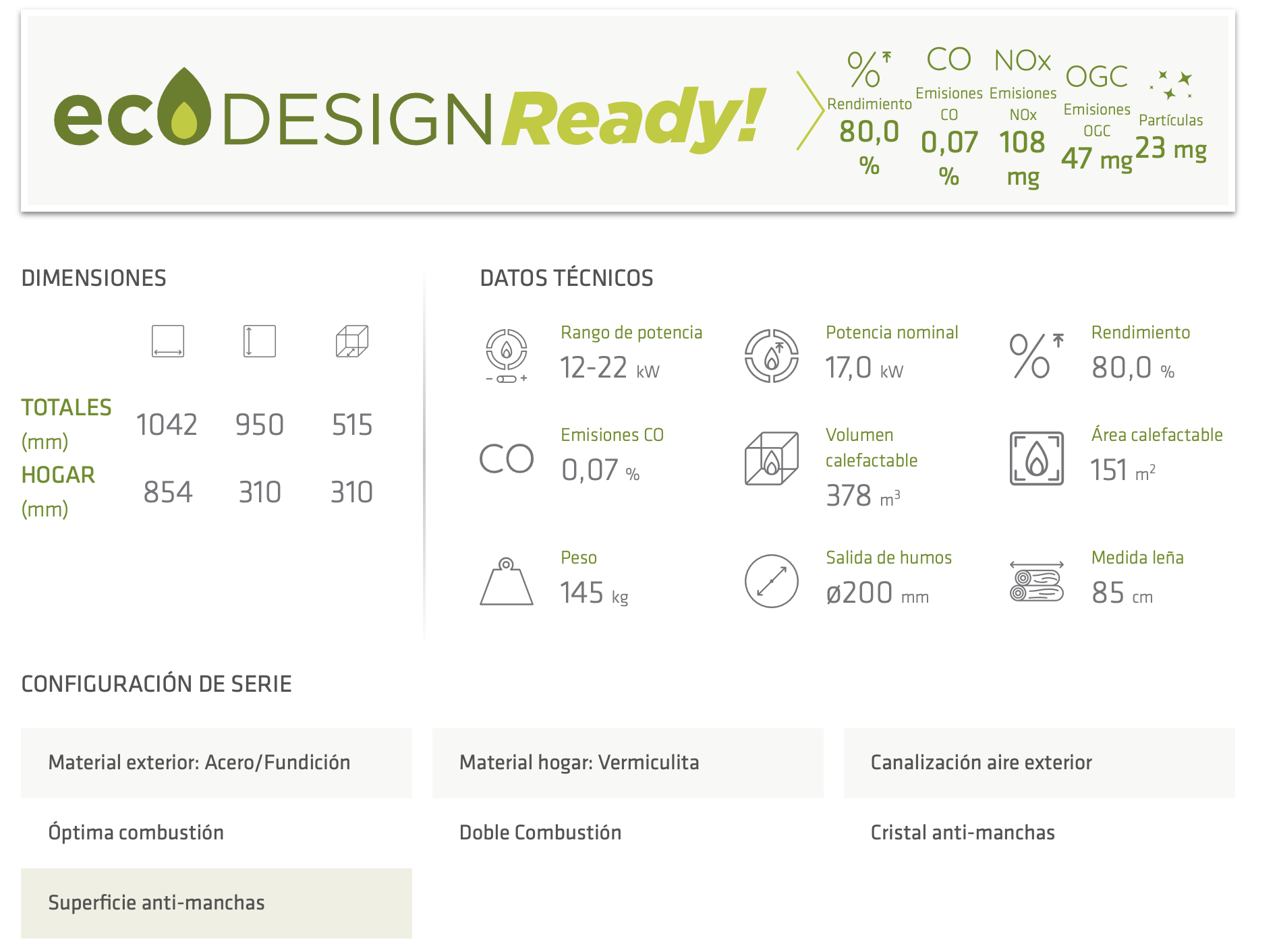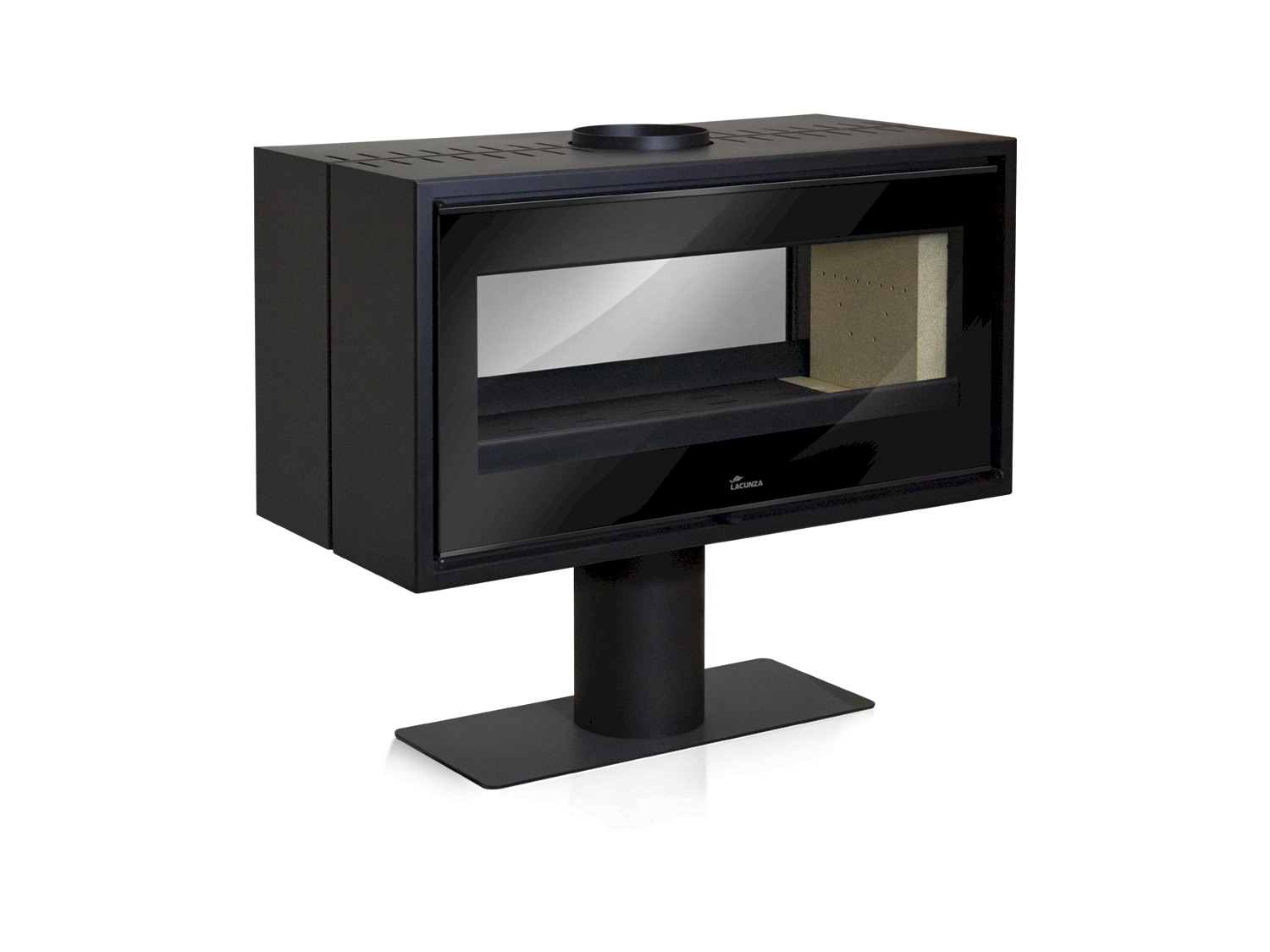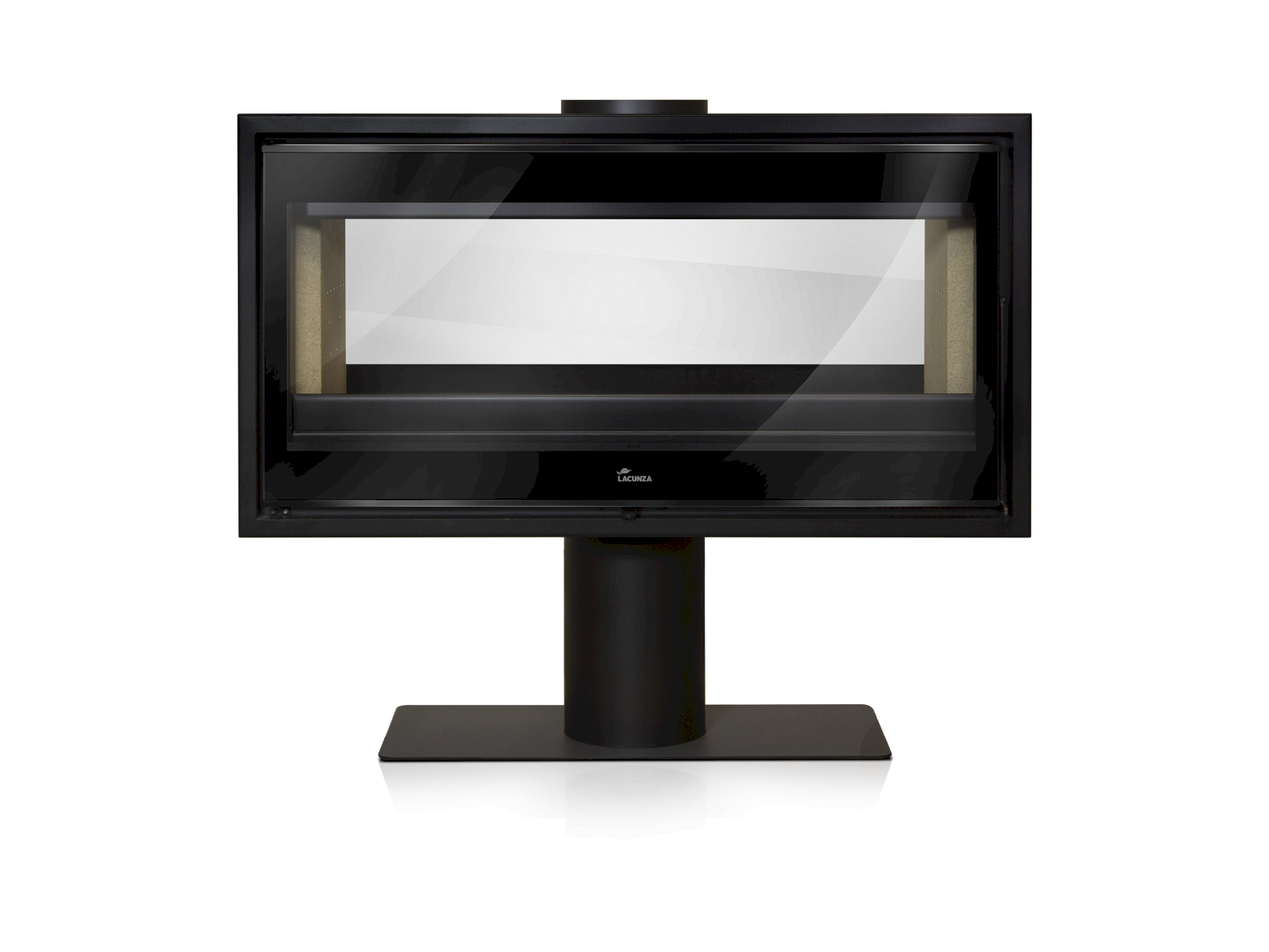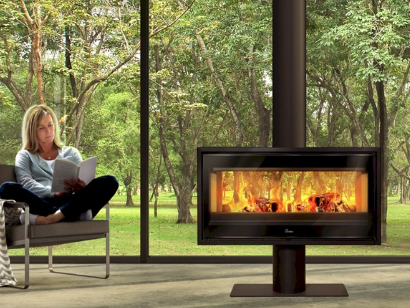 VERONA, una estufa de leña panorámica de doble cristal concebida como un aparato compacto de líneas depuradas. Diseñada para ofrecer la mejor transparencia en el ambiente y separar distintas estancias si se desea.